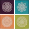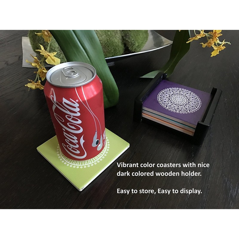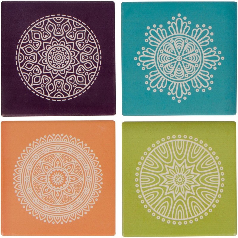 • Set of 4 designer coasters. Each coaster has a different mandala circle design and a different vibrant color.