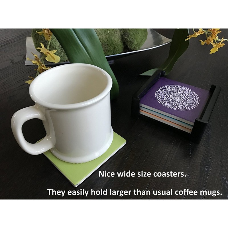 • Nice wide size, almost 4 X 4 inches making it ideal for everything from oversize beer mugs, wine bottles to large coffee cups. Each coaster has soft cork back, making it scratch free for your tables.