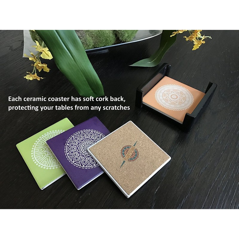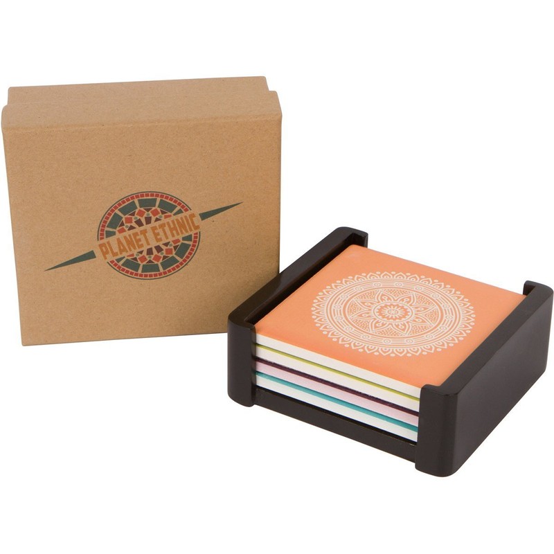 Planet Ethnic Colorful Mandala Circles Designer Ceramic Coaster Set (4 Coasters, Each Almost 4 X 4 inches) with Matching Wooden Coaster Holder.