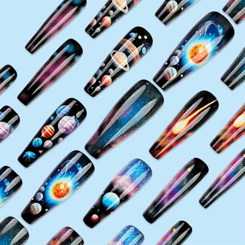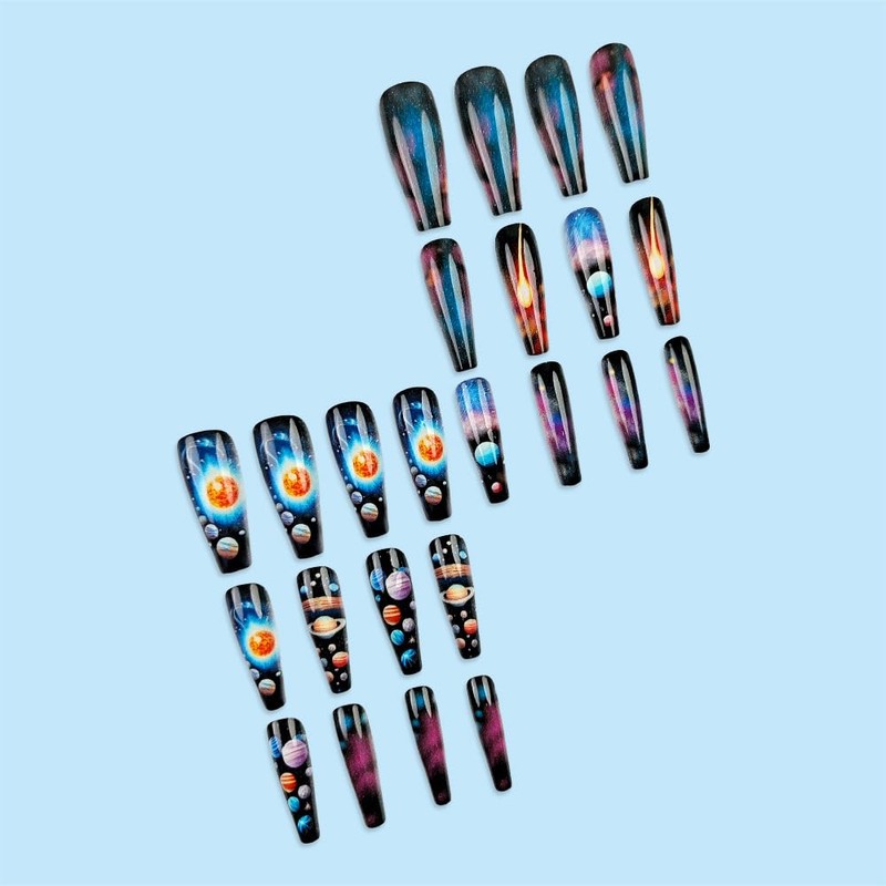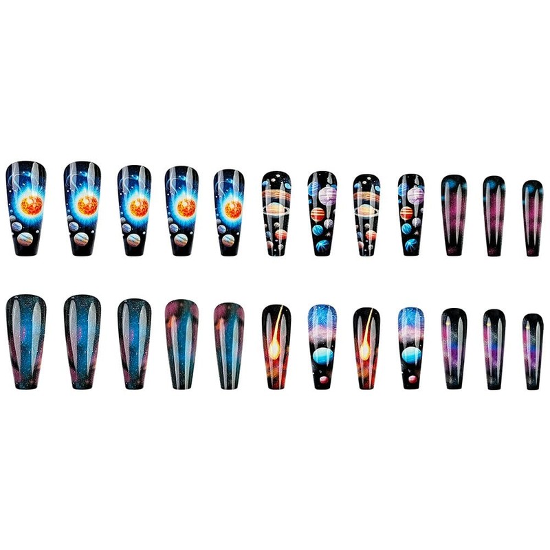 - Wide Usage: These space press-on nails are designed with length elegant shape and a classic fake nails to make you stand out and look charming. Perfect for daily home manicures, weddings, proms, parties, birthdays, dates, and other special occasions. They also make an ideal gift for birthdays, valentine's day, Halloween, Christmas, and more. You can customize your own press-on nail art to suit your personal style