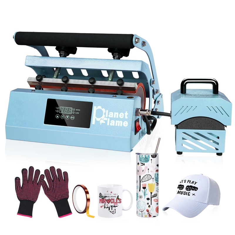 - 【Tumbler & Hat Combo Press Machine】The PlanetFlame 2-in-1 heat press integrates a tumbler mug and cap press. It's compatible with sublimation, HTV, and infusible ink projects, with simple host connection for operation.
