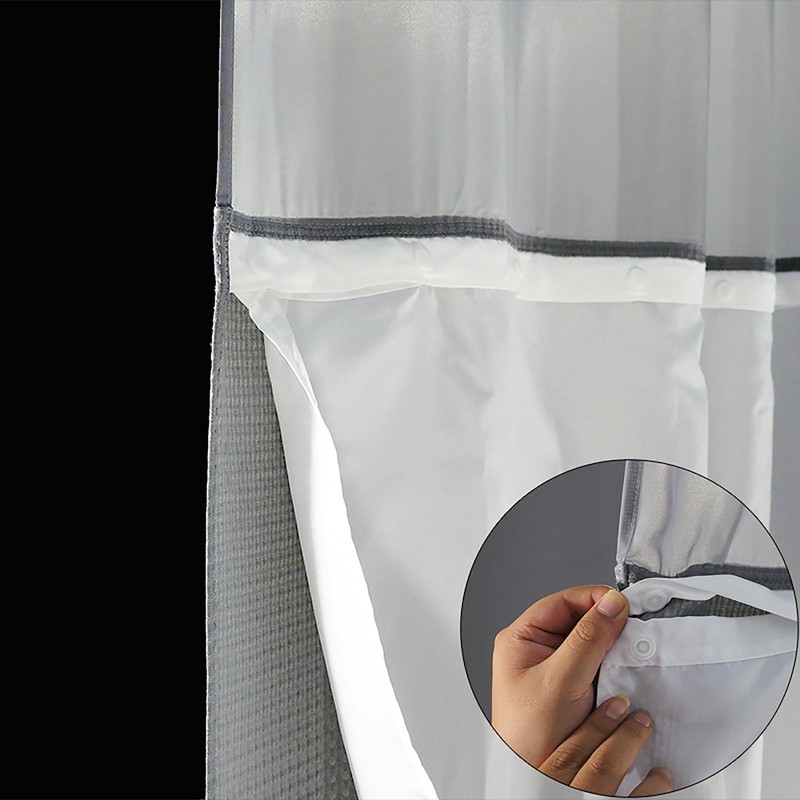 - Two-layer shower curtain: The outer layer has a waffle fabric design, and the inner layer is a waterproof shower curtain with snap buttons.The fabric liner can be wipe-clean and it’s removable with its snap-in buckles.A mesh upper panel lets light in and allows air to circulate, see-through while maintaining privacy, creating a spa shower experience.