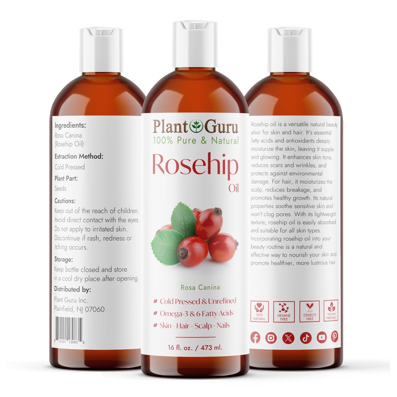 Plant Guru Rosehip Oil Unrefined 16 fl. oz. 100% Pure Cold Pressed – Nourishing for Skin, Hair, Scalp, and Nails – Hydrating, Moisturizing, and Rejuvenating.