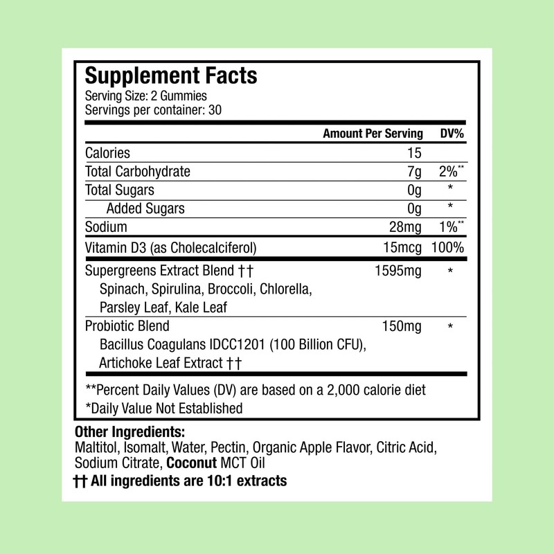 • Antioxidant-Rich Phytonutrient Powerhouse: Boost your daily antioxidant intake with our phytonutrient-rich gummies. Formulated with a variety of leafy greens and vitamins, they offer a convenient way to fortify your body against oxidative stress and support overall health.
