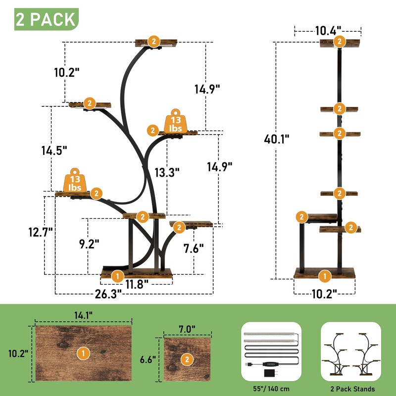 - 【2 Piece Plant Stands, Double the Space】 This lighted plant stand set of 2(7 tiers each) provides 14 total growing levels. Perfect for expanding your indoor garden without crowding plants. Generous spacing between shelves allows plants more vertical growing room. 2 separate stands maximizes vertical and corner areas - no more cluttered floors, just a clean and organized living area.