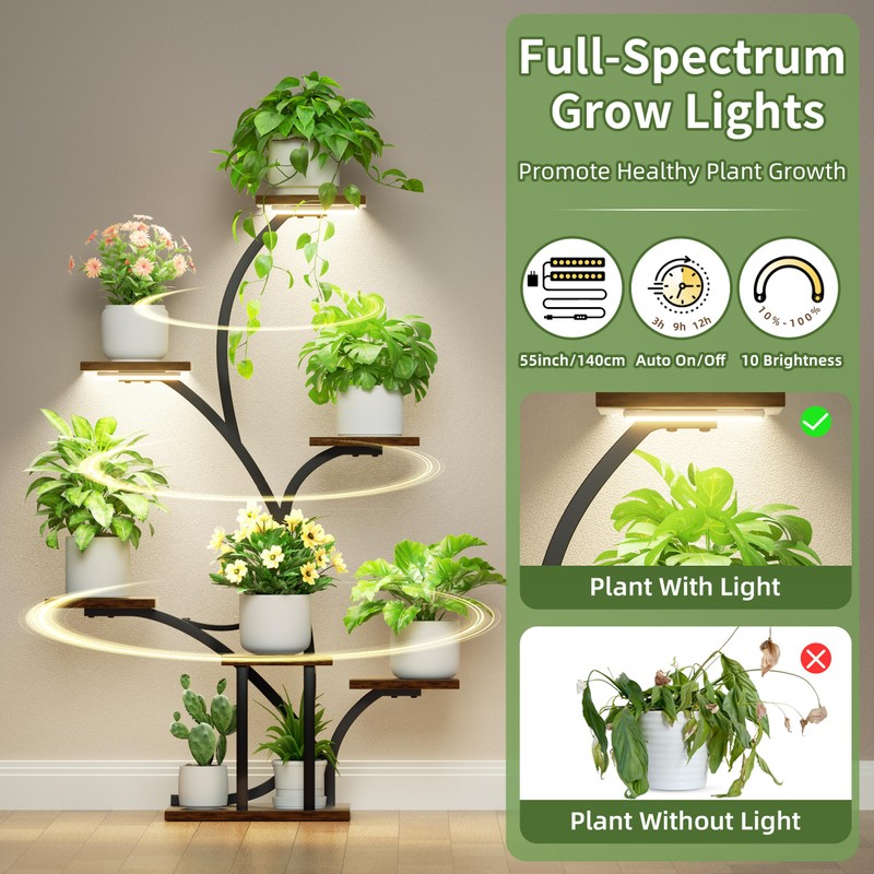 - 【Grow Light for Healthy Growth】 This plant shelf indoor features full-spectrum grow lights with adjustable brightness and a built-in timer (3/9/12h settings) for indoor plants. Ensure your plants get ideal lighting for every growth stage. No more moving your plants to the window or outdoors for sunlight! It's the ultimate hands-free solution for busy plant parents.