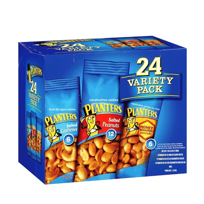 - Includes 12 1.75-oz packs of Salted Peanuts, 6 1.75-oz packs of Honey Roasted Peanuts and 6 1.5-oz packs of Salted Cashews