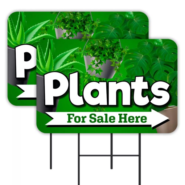 Capture attention with our PLANTS 2 Pack Double-Sided Yard Signs. These signs are printed on both sides to make placement very convenient. Our signs are made of the highest quality corrugated plastic and printed in vivid bright colors with UV resistant ink. We round the corners to give your sign a professional look.