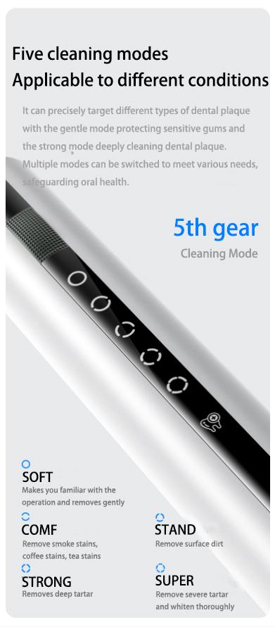 【Safe and Convenient】 This tool is designed for teeth cleaning and includes 5 modes to effectively clean your teeth, catering to different needs. It comes with two types of replacement cleaning heads (flat and pointed) for surface and deep cleaning of teeth.