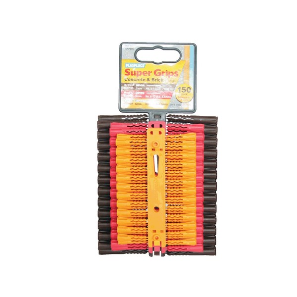 Plasplug SuperGrip fixings are highly versatile. They are suitable for concrete, brick and stone solid walls. The plugs feature multi-action grips and expanding barrels.Typical applications include: shelving, curtain poles, lighting, hooks and brackets, pictures and mirrors.