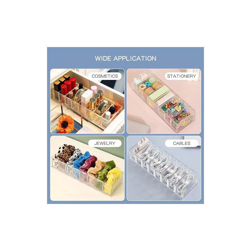 - Space-Saving Design: Compact and stackable, the organizer efficiently utilizes desk or shelf space while keeping items accessible and visible.