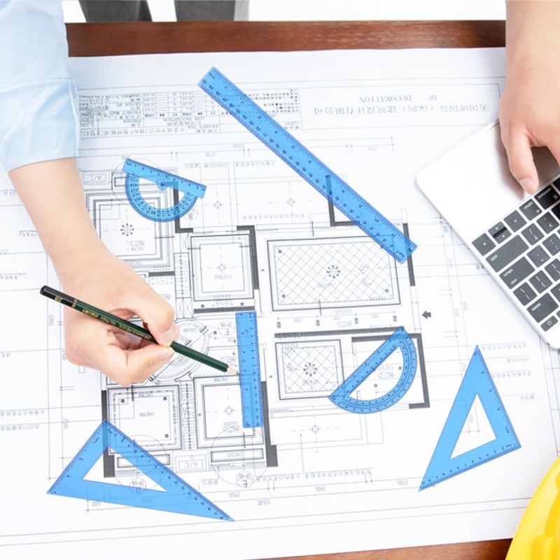 Plastic Clear Ruler Math Set, 6" | 12" Straight Ruler Protractor, 2 Protractors 180 Degree 2 Triangle Rulers 45 | 60 Degree 2 Straight Rulers Measuring Tool for School Office Home Supplie,Blue