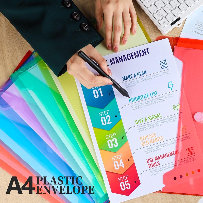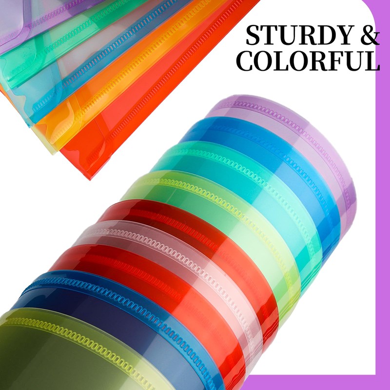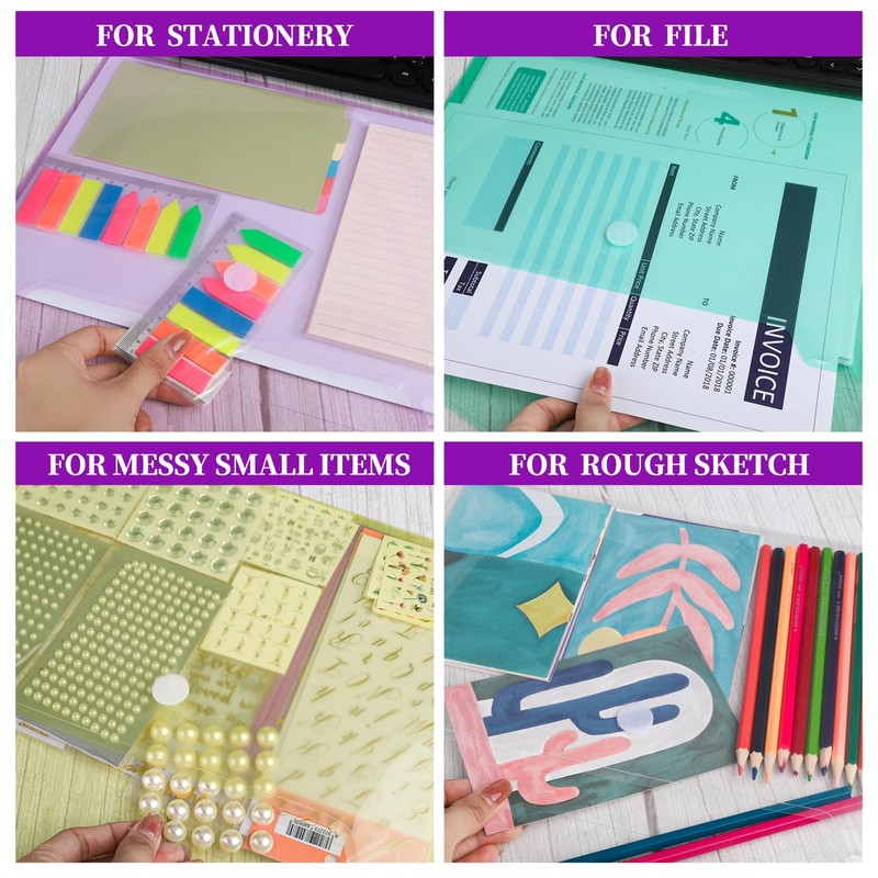 - Multipurpose Plastic File Folders: A4 plastic file envelopes, great for papers, stationery, brief report,bills, receipts, appliance instructions, photos, for craft items, craft papers, stickers, embellishments, for storing travelling items, makeup items and so on. Suitable for school, office, home, travel etc..