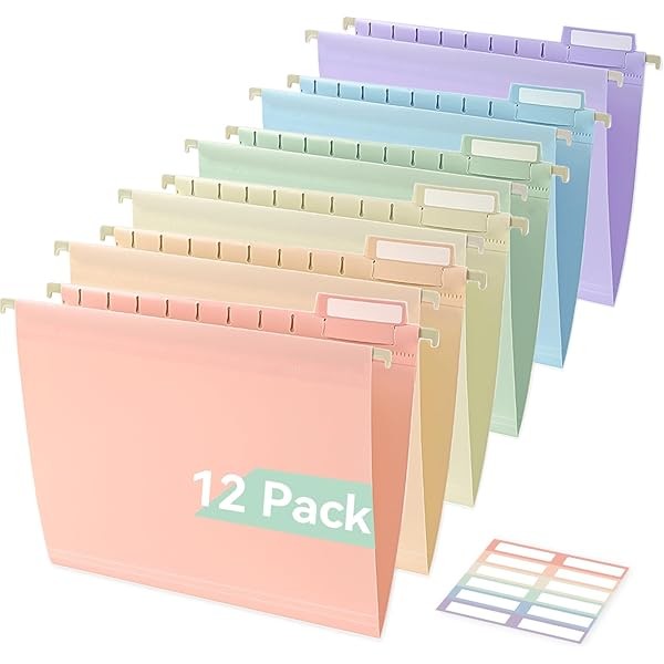 Plastic Hanging File Folders, Letter Size, 12 Pack Pastel Hanging Folders, with Insertable 1/5-Cut Tabs for Filing Cabinets