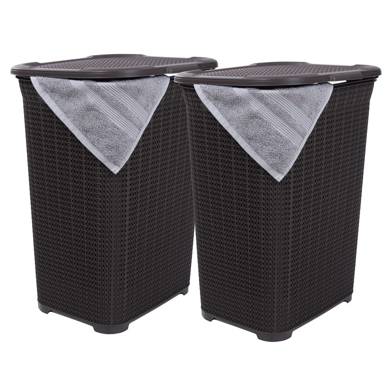 Plastic Laundry Hamper with Lid, 2 Pack Knit Designed Laundry Hamper Basket, 50 Liter, Brown Cloths Hamper Organizer with Cut-out Handles. Space Saving for Laundry Room Bedroom Bathroom.