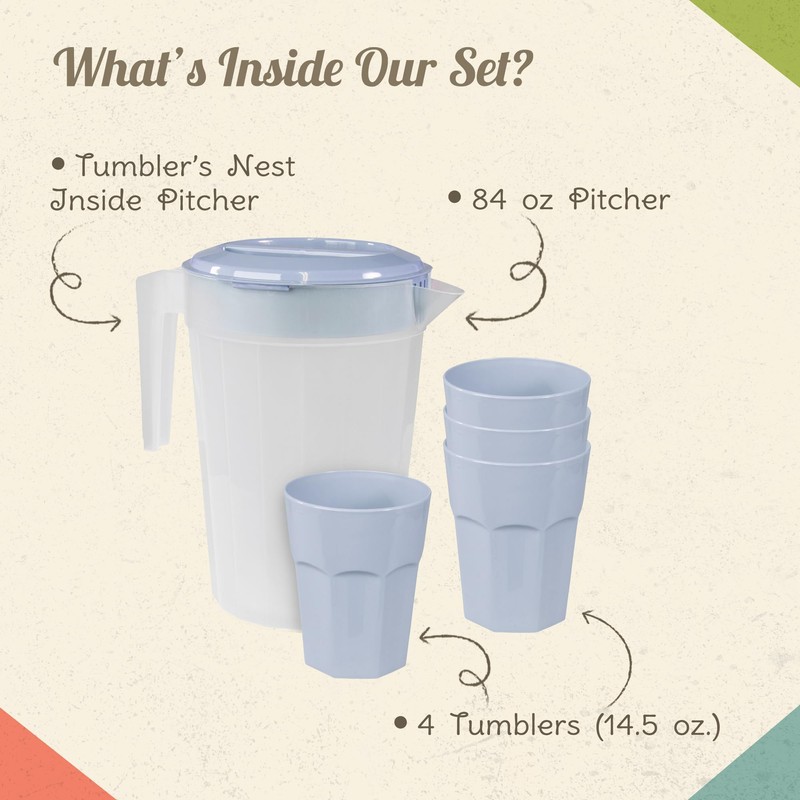 - Toast without Fuss: No more drinking woes with our sturdy polypropylene plastic pitcher with built-in cup storage. Whether for wild outdoors or cozy indoor toats, this lightweight, dishwasher-safe pitcher set is a breeze to carry and clean up.