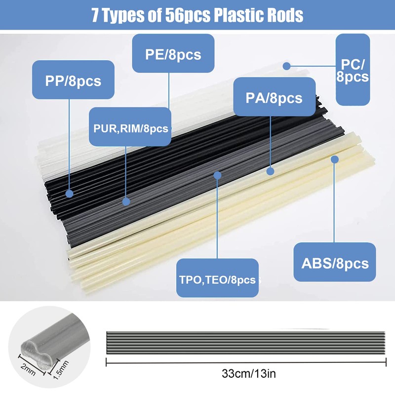 • 🌈【Applicable materials】This repair kit for plastic welding machines can be used with different plastic materials to expand your repair project. Our plastic welding machine kit comes with 4 different types of welding heads and 56 pieces plastic welding rods (ABS/PP/PE/TPE/PC/PUR/PA) configured to meet your different requirements.