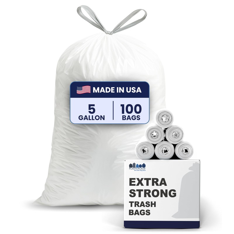 Plasticplace 5 Gallon Trash Bags - White Drawstring Garbage Bag Liners, 19" x 25" (100 Count) – Durable, Leak-Proof, Multi-Purpose Tall Kitchen, Bathroom, Office and Car TrashBags Plastic Bags 0.9 Mil