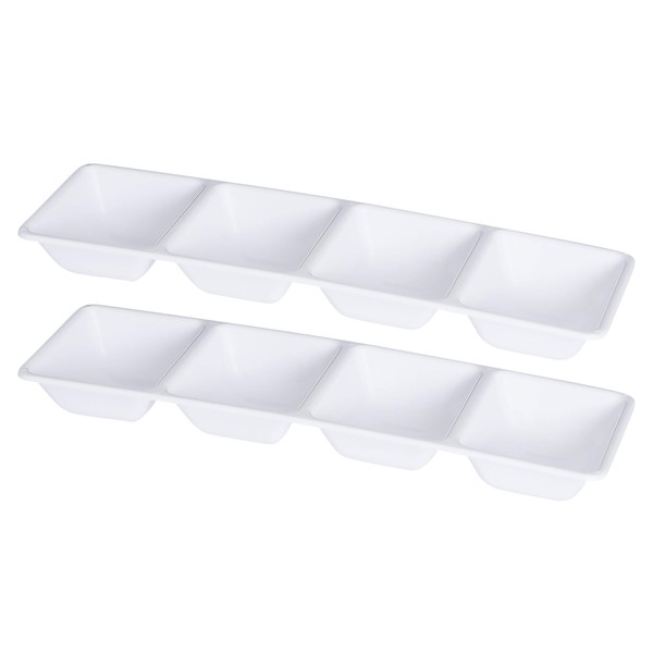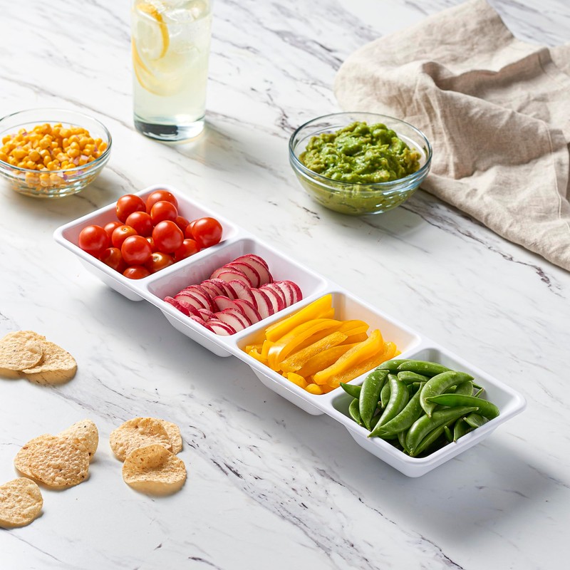 - SIZE 5'' X 16'' Rectangle White serving plate / Platter / Tray consists of 4 divided sections which is excellent for serving snacks and appetizers, Dips, each section are amply sized for chips and salsa, veggies and dip, shrimp and cocktail sauce and much more