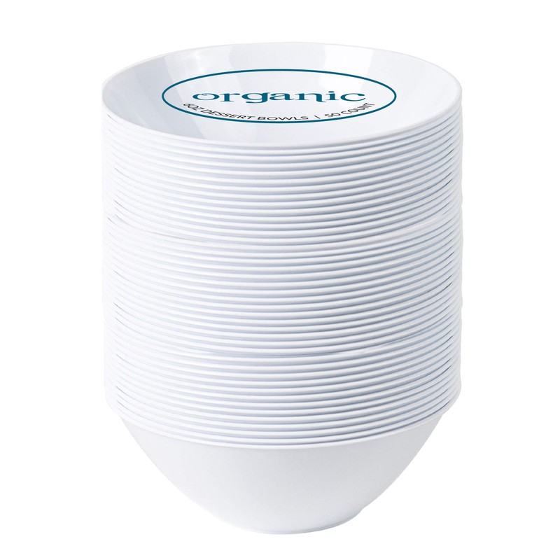 - [6 OZ 50 Count] White Plastic Organic Party Dessert bowls Premium heavyweight Elegant Disposable Tableware Dishes