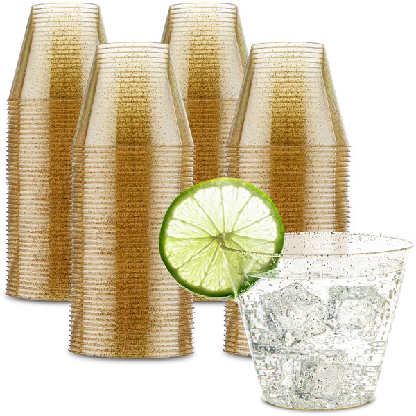 PLASTICPRO 9 oz Disposable Plastic Party Cups,Old fashioned Designed Tumblers, Gold Glitter 200 Count,