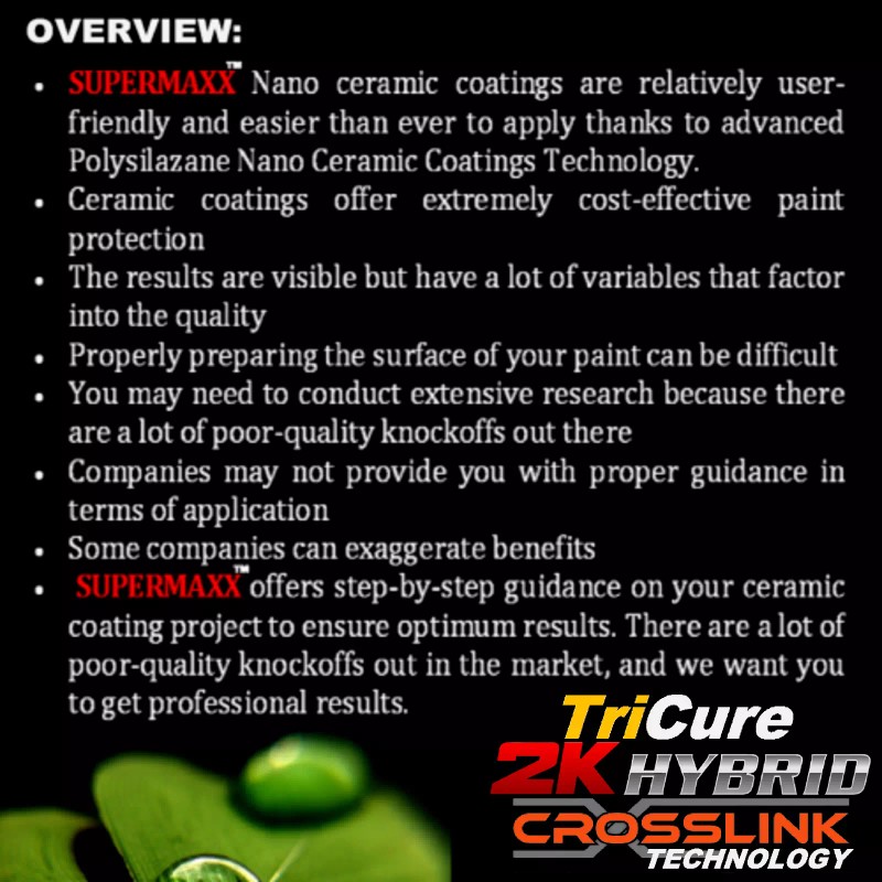 SUPERMAXX HYBRID CERAMIC COATINGS with TriCure Technology are Polysilazane Resins & Polymer formulas with proprietary 2K Crosslinking for the ultimate surface protection.