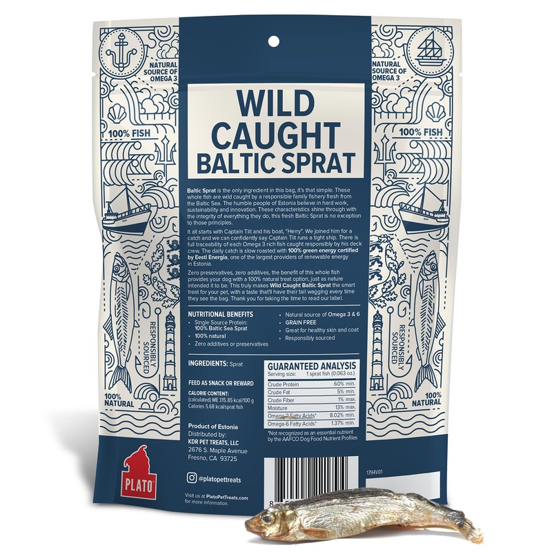 - One Ingredient Dog Treats: Our wild caught Baltic Sprat fish dog treats are sustainably wild-caught from the Baltic Sea. These whole fish dog treats are a natural and nutritious choice for your furry friend.