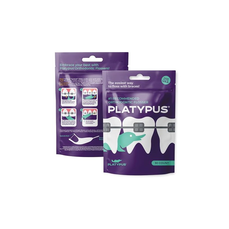 Platypus Platypus Orthodontic Flossers - Fights Bad Breath - Picks for Braces, Fits Under Arch Wire, Will Not Cause Damage - Vegan and Biodegradable - Unflavored and Shred Resistant - 30 Count