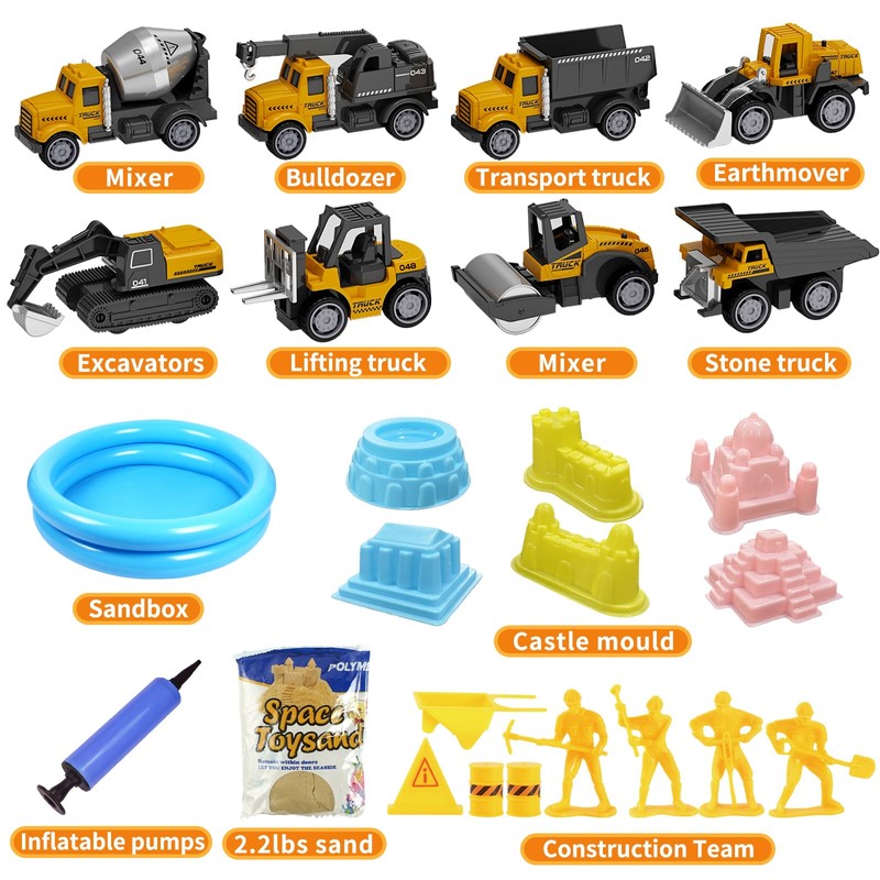 - Construction sand game set-Construction sand toys include 2.2 pounds of game sand, 8 alloy construction vehicle toys: 1 bulldozer, 1 excavator, 2 dump trucks, 1 cement mixer, 1 forklift, 1 crane, 1 compactor, 1 inflatable sand box, 1 storage box, 8 construction worker models and road signs, 6 castle modeling molds.