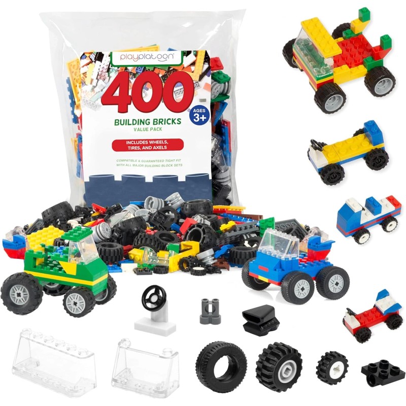 Play Platoon 400 Piece Building Bricks Kit -Car Building Set with Wheels, Axles & Windshields