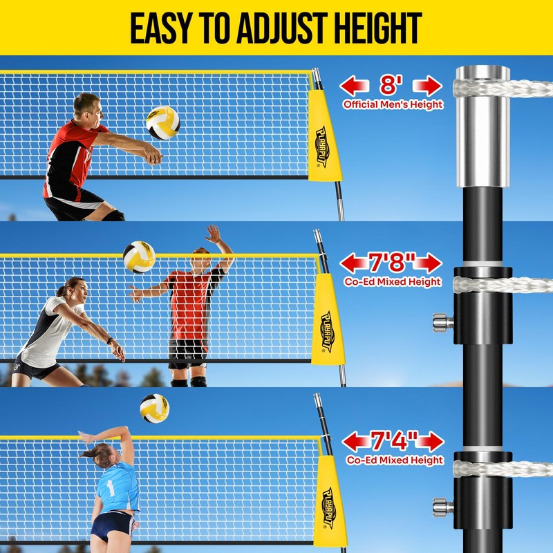 - 🏐【Adjustable Height for All Peoples】The freestanding volleyball training net can be easily adjusted a height of 8' for men, 7'8" for official coad, and 7'4" for women. Height adjustable volleyball nets for all heights and skill levels, great for family gatherings, school events, clubs and more!