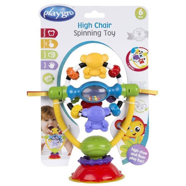 Keep your baby entertained with the Playgro High Chair Spinning Toy, perfect for stimulating motor skills with its colorful, spinning activity rattle that easily attaches to any flat surface.