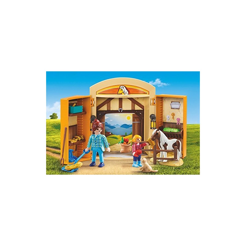 Gallop into fun with the Pony Stable Play Box. While the mom cleans the stable area, the child can treat the pony to some apples and carrots. To begin playing, simply fold open the two side panels to reveal a well-kept stable filled with everything needed to look after this spirited animal. Perfect for on-the-go play, all the pieces can be stored inside this portable set and the top can be turned into a handle, making it a must-have travel accessory. Set includes two one adult figure, one child figure, grooming tools, apples and carrots, pitchfork, shovel, hay, dog, and lots of other accessories. Recommended for ages four and up.