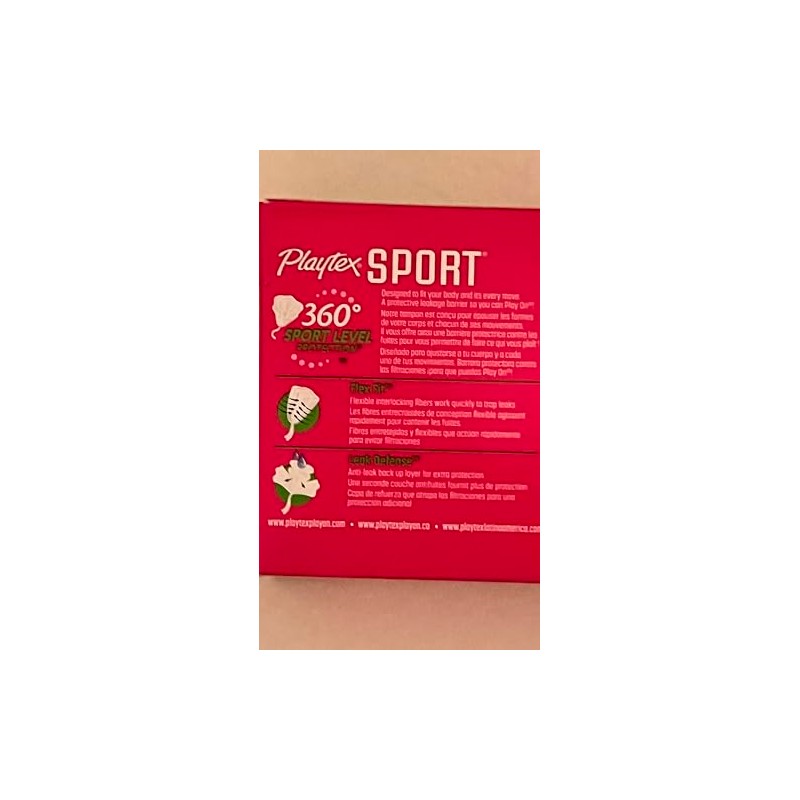 Playtex Sport 360 degrees - Sport Level Protection. Designed to fit your body and its every move. A protective leakage barrier so you can Play On! Flexible interlocking fibers work quickly to trap leaks. Anti-leak back up layer for extra protection.