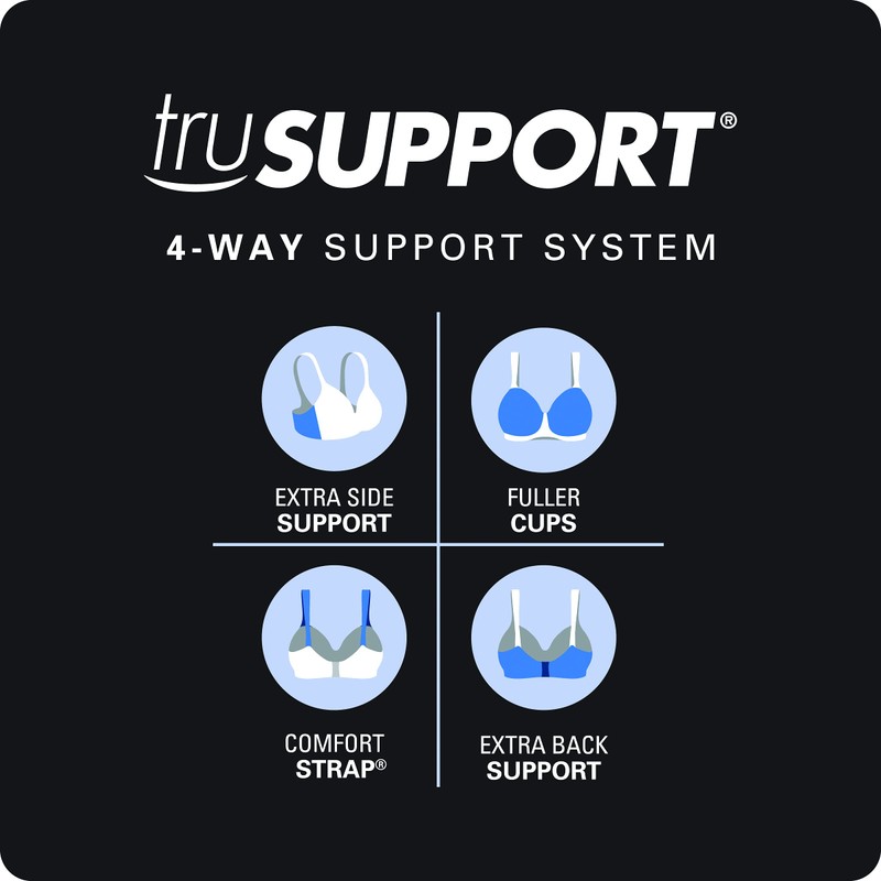 - SUPERB WIRELESS SUPPORT - 4-way TruSUPPORT system provides higher sides for bulge control, fuller cups for natural shaping, wider, cushioned straps for all-day ease, and a smoother back for enhanced stability.
