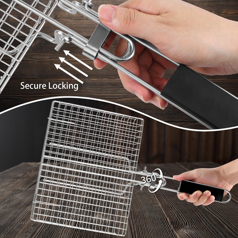 - 【360° Lock & Rotate Even Cooking System】The patented slide-lock buckle secures the grill basket lid tightly during flipping. Rotate the entire basket 360° over flames to cook meats, veggies, or delicate fish fillets evenly on all sides. No more charred spots or undercooked centers—just juicy kebabs and flawless salmon using the fish grilling rack design!