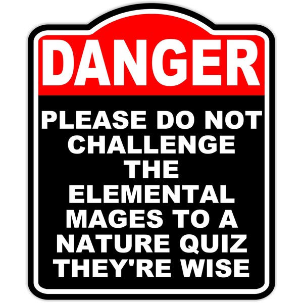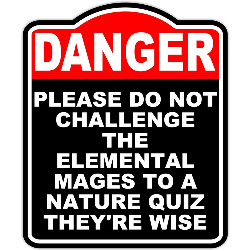 PLEASE DO NOT CHALLENGE THE ELEMENTAL MAGES TO A NATURE QUIZ THEY'RE WISE Danger Red Black Aluminum Composite Sign 20 x 24 inches