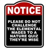 PLEASE DO NOT CHALLENGE THE ELEMENTAL MAGES TO A NATURE QUIZ THEY'RE WISE Notice Red Black Aluminum Composite Sign 20 x 24 inches