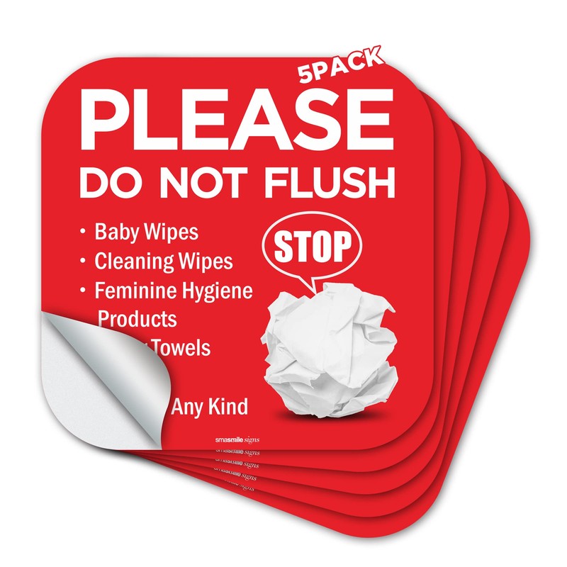 - ✅PERFECT SIZE: 5 pcs of Please Do Not Flush Wipes Stickers, Size: 6 inches width x 6 inches height. Clean lines and White & Red background maximizing visibility in any surface.