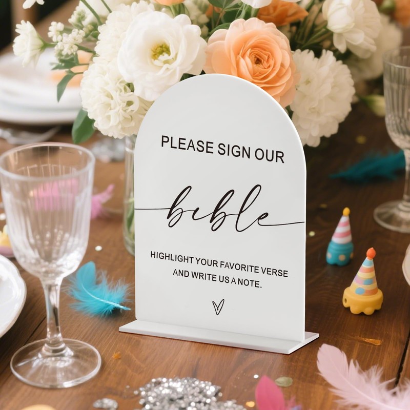 Please Sign Our Bible Acrylic Wedding Sign – 5"x7" Arch Sign with Base Calligraphy Table Sign for Guest Book, Ceremony Reception Decor