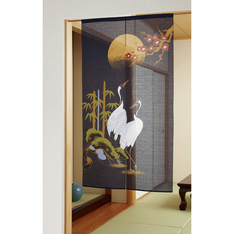 Pleasure Noren Crane with Shochiku Plum Width 33.5 x Length 59.1 inches (85 x 150 cm), Gold Color Noren