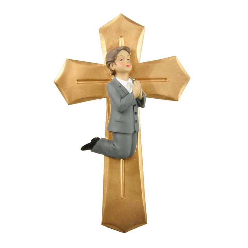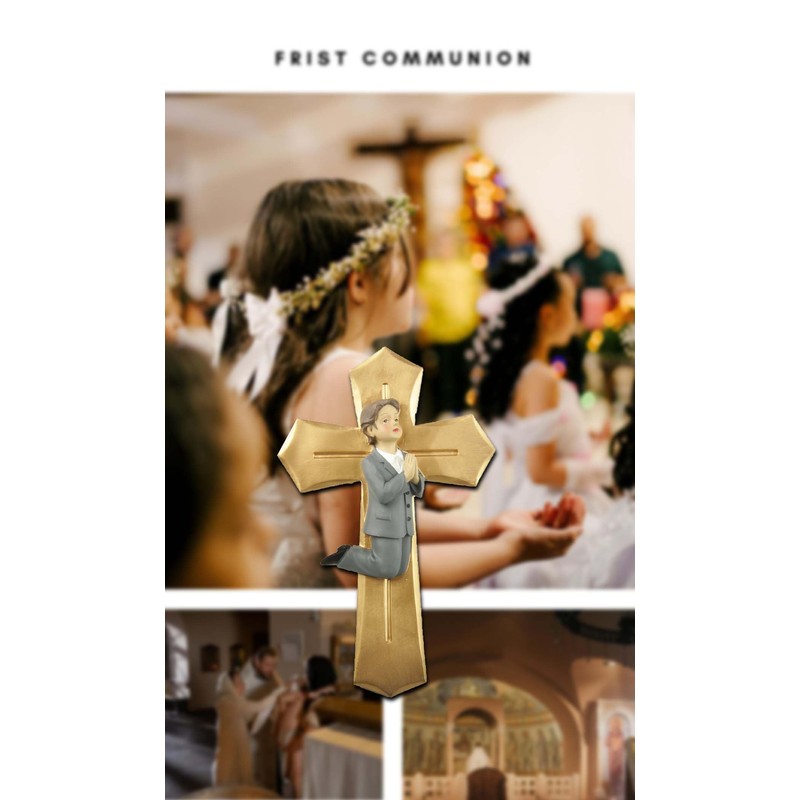 PlentifulHome This hand-carved off white resin crucifix statue is religious artwork that shows the Holy Spirit family and the Jesus family