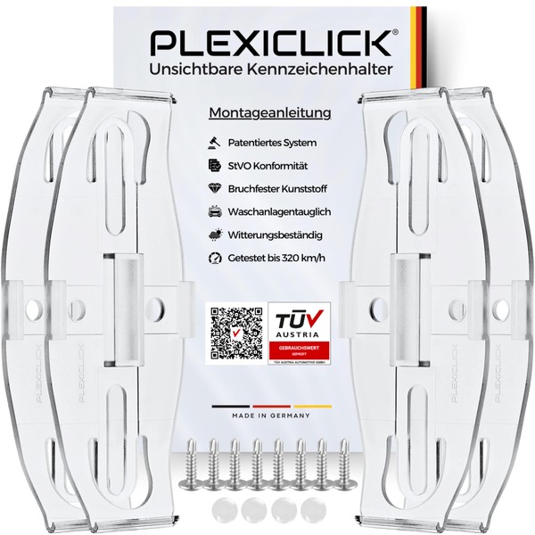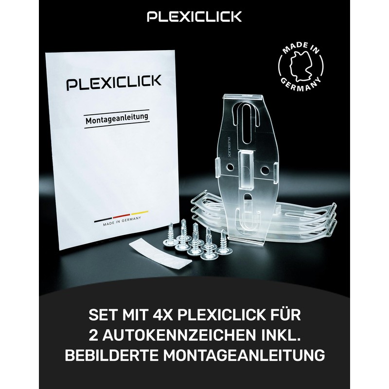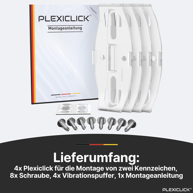 - Complete set for two number plates: one set contains 4 x Plexiclick number plate holders, 8 x automotive screws, 4 x silicone pads, 1 x detailed assembly instructions (English language not guaranteed).