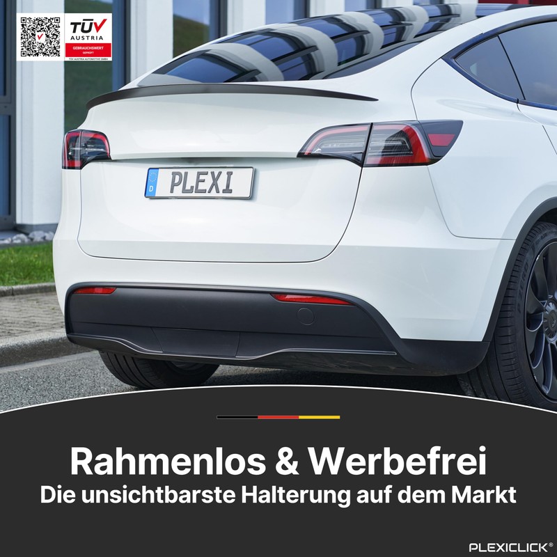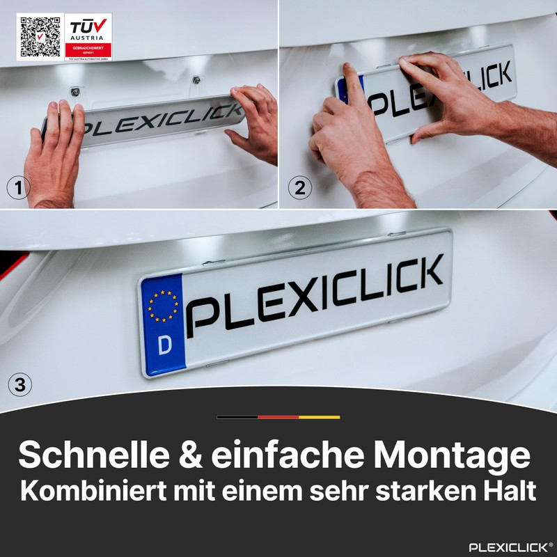 - [Frame less and advertisement-free] The Plexiclick combines the optical advantages of Velcro number plate holders or magnetic number plate holders with the advantages of standard frameless number plate holders: An invisible solution, with no need for laborious gluing or Velcro. This makes the Plexiclick the smartest solution in frameless number plate holders.