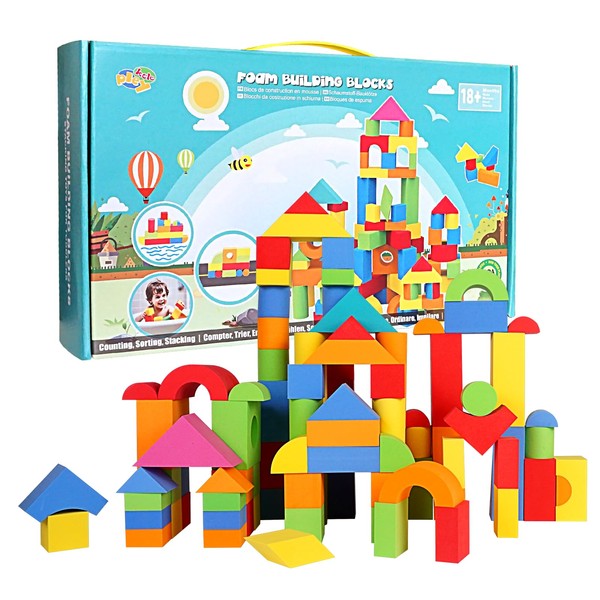 - Includes over 90 foam blocks in various shapes, allowing kids to create castles, animals, numbers, letters, and more