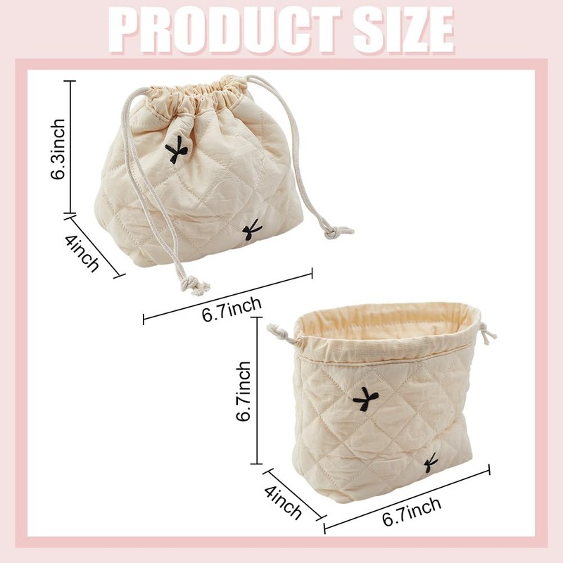 PLIGREAT Small Drawstring Makeup Bag Cotton Quilted Cosmetic Bag with Canvas Lining White Bow Style Portable Make Up Organizer for Traveling Toiletry Cute Women Gift