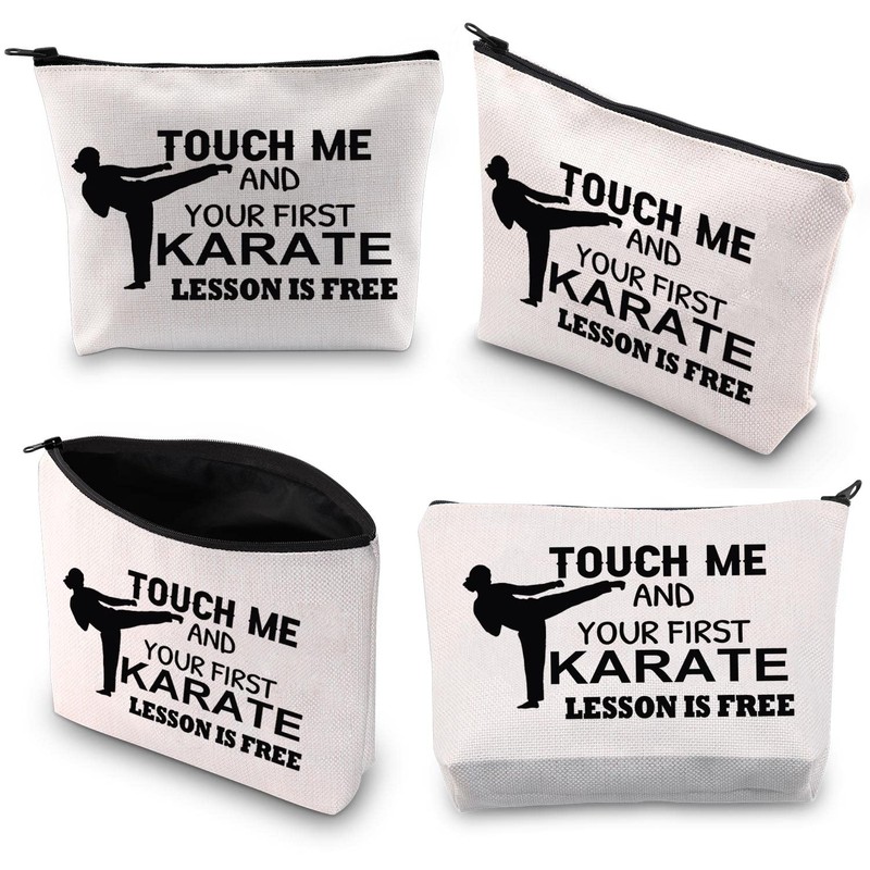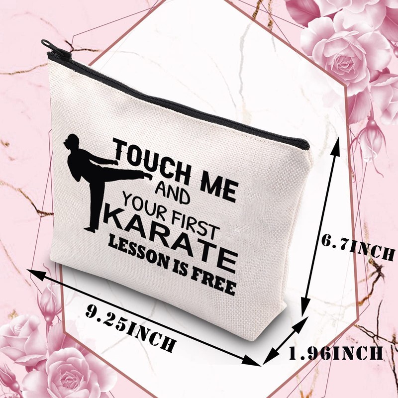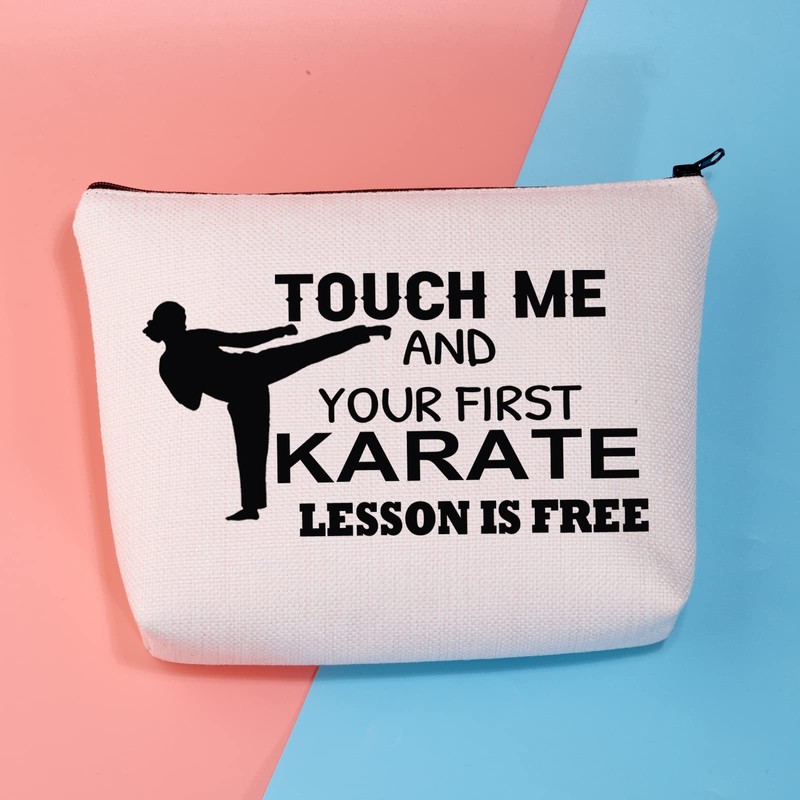 - Bag with Karate Quote: TOUCH ME AND YOUR FIRST KARATE LESSON IS FREE. Are you looking for gift Ideas for Karate Instructor, Karate coach or Karate Girl? This cosmetic makeup bag is the perfect girt for them!