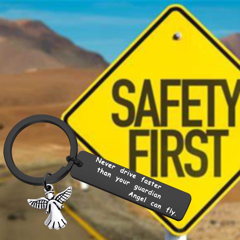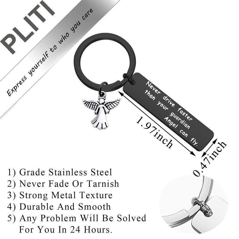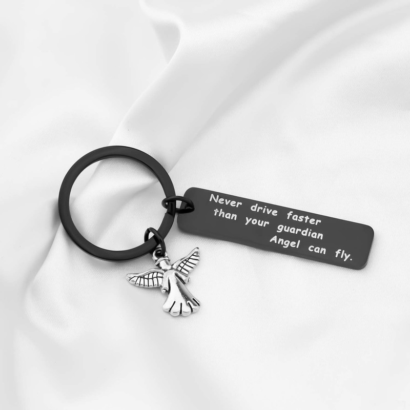 - Never Drive Faster Than Your Guardian Angel Can Fly Key Chain:Stamped with " Never Drive Faster Than Your Guardian Angel Can Fly", meaningful and personalized gift for teens who are new drivers. A great gift for a Sweet 16 birthday,any parents that has a child with a driving permit.,or Daddy Mommy new drivers, It is a perfect reminder accessory to remind your loved one to drive safely.