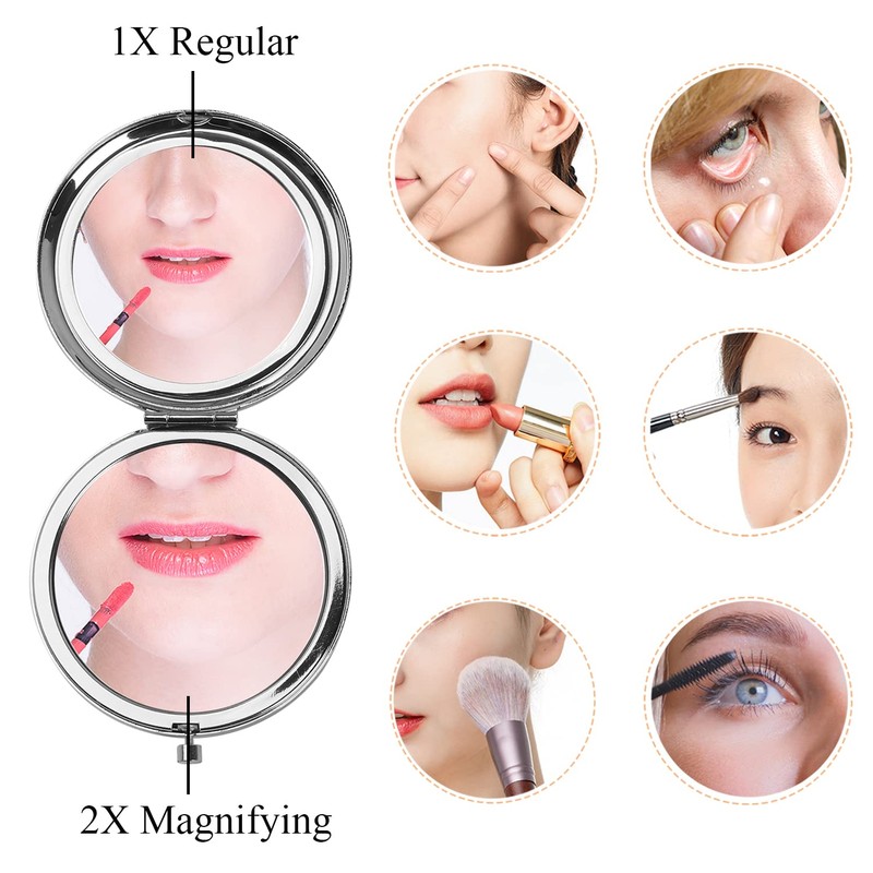 - ★ Doppelseitiger tragbarer Spiegel: 1 x Seite zeigt kristallklare Reflexion, die genau sicherstellen kann, dass Ihr Lippenstift, Augen-Make-up und Ihre Frisur intakt sind, eine andere Seite ist 2-fache Vergrößerung, die Ihr perfektes Make-up als Ganzes sehen kann und jedes Detail perfekt pflegt. Größe: 6,5 x 1 x 7 cm. Tipps: Aufgrund manueller Messung sind Abweichungen möglich.