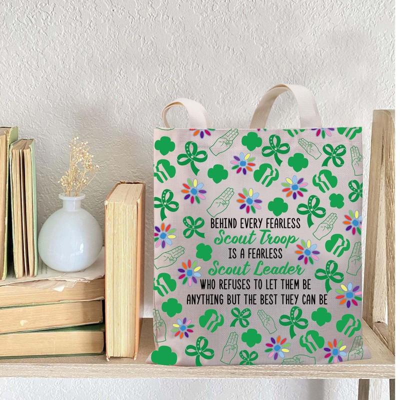 • Bag with Girl Scout Quote: BEHIND EVERY FEARLESS SCOUT TROOP IS A FEARLESS SCOUT LEADER WHO REFUSES TO LET THEM BE ANYTHING BUT THE BEST THEY CAN BE. Great tote bag to Girl Scout Leader, Scoutmaster, Scout Girl and Scout Troop Leader as thank you gifts or Appreciation Gift !